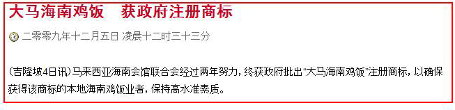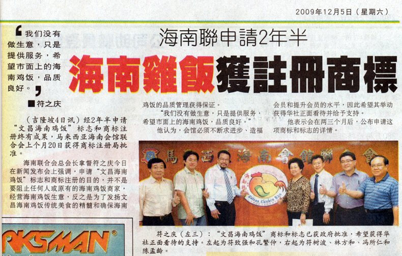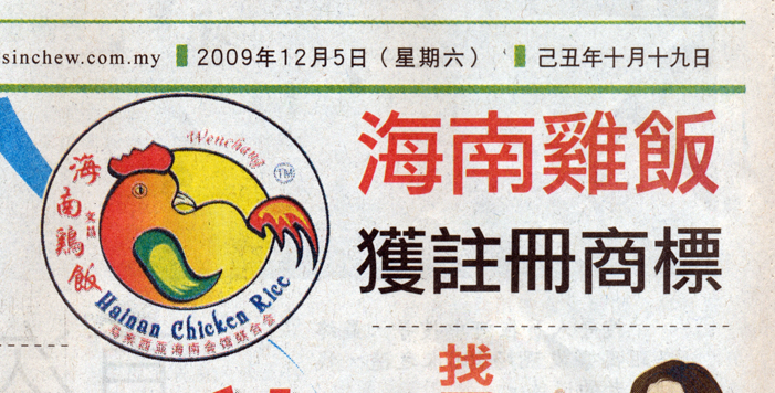 把祖国海南省文昌海南鸡饭成功注册成商标